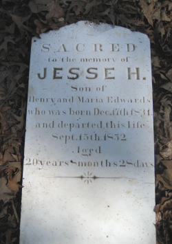 Sacred to the memory of Jesse H. son of Henry and Maria Edwards who was born Dec. 17th 1831 and departed this life Sept. 15, 1852 Aged 20 years, 8 months and 28 days