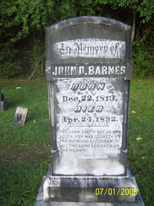 Bio: 1870 Clinton, Greene Co., Alabama census: John D. Barnes age 57 born NC, Pherabe 36 NC, Margretta 15 AL, Louisa 14 AL, Edwin 12 AL, Mattie 10 AL, Jennie 2/12 AL
