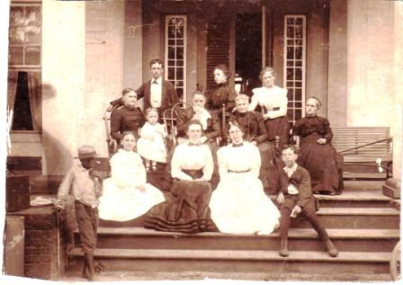 Back: Mr. & Mrs. CMA Rogers, Martha Campbell, Tolu Byrd (Julia Blocker), Nina (Alexina Wheeler), Borden M. Campbell (behind Nina). Front row: Parham B. Borden, Ella Pollard (son to be Parham's wife), John Blocker Byrd, and an unknown woman.